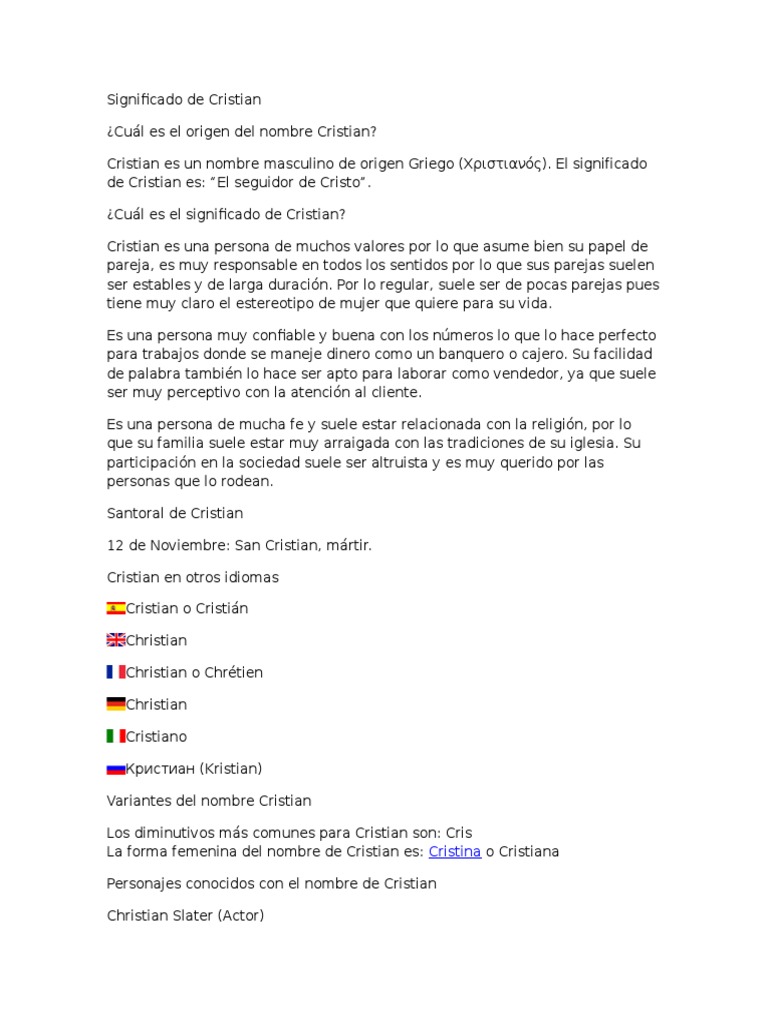 En el artículo de hoy hemos querido. El nombre Cristian es de origen griego y significa cristiano seguidor de Cristo. Honor y honradez son cualidades que se desprenden del significado de ChristianEs una persona reconocida por su confianza y sin duda quienes llevan este nombre y los padres que deciden ponérselo a sus hijos buscan que obtengan la gracia y cualidades de la personalidad.