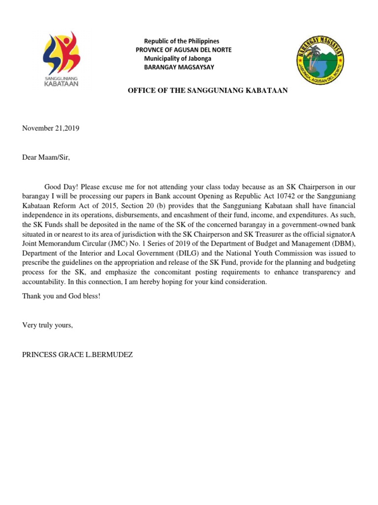 RESIGNATION LETTERDear SirI am Lea B. In January 2016 the Sangguniang Kabataan Reform Act was signed into law which made some significant changes to the SK and initially scheduled new elections for. Guidelines on the Appointment of Sangguniang Kabataan Secretary and Sangguniang Kabataan Treasurer at the Barangay Level August 15 2018.
